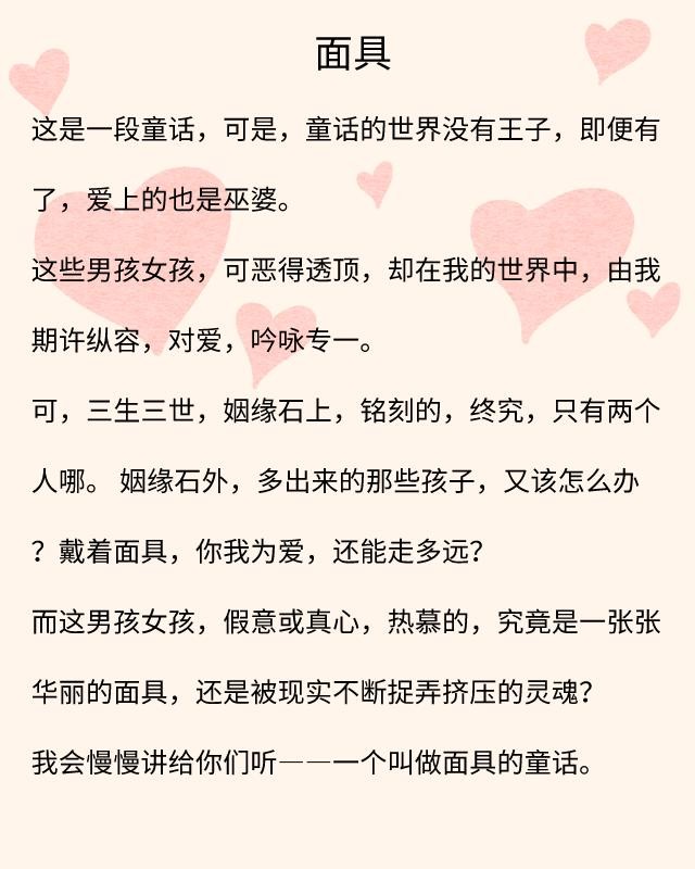《面具》是在《十年一品温如言》之前写的作品,比后者更加悲伤更加疼痛。童话即使人人都有一副假面具,但结局都是好的,而这里的每个人的面具,都会让人的心感觉钝痛。