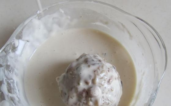 3.将面粉放入盘中,加入适量的水,进行一定量的搅拌成稀糊状,将糯米团放入其中,使其表面具有一层面粉包裹即可。
