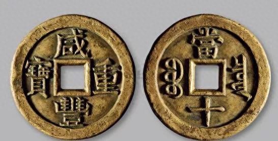 当时清朝的军费开支大增,而税额收入大减,再加上鸦片战争的影响,导致财政拮据,为了筹款继续镇压太平军,缓解财政危机,于咸丰三年(公元1853年)清廷被迫铸大钱。咸丰大钱是在迫不行已的情况下铸行的。"咸丰重宝"始铸当十大钱,继而又开铸当五十、当百和当伍百以上,并令全国各省迅速铸造推行。"咸丰重宝"铸行情况十分混乱复杂,当值等次,大小轻重,铸造材质,铸造工艺,文字书体,钱文等,在各局甚至在同一局监内铸造时,都差异很大,以至有当值大小和钱体大小轻重倒置的,此外还有铁钱和铅钱。