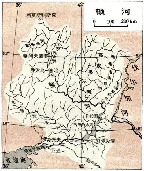 顿河源出中俄罗斯丘陵,注入亚速海的塔甘罗格湾,长1870km,流域面积42.2万km。