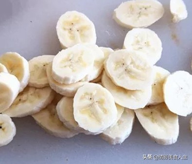 1.香蕉选择外皮稍微有一点青的,口感比较好。剥皮切厚度合适的薄片,放入盘中。