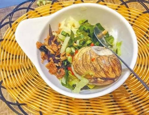 屈头蛋看着有点难以入口,但放上香料、山黄皮、萝卜片、酸姜丝、薄荷、柠檬汁,开胃爽口。