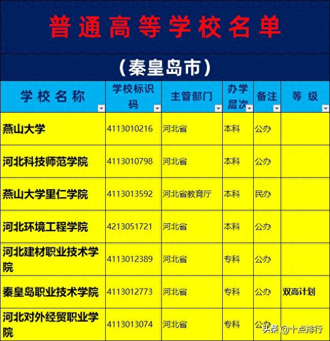 十点排行说明:2019年秦皇岛市大学名单一览文章发布时间为2019年12月,大学名单为普通高等学校名单,不包含军校名单。