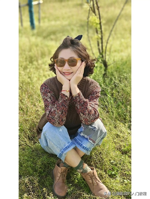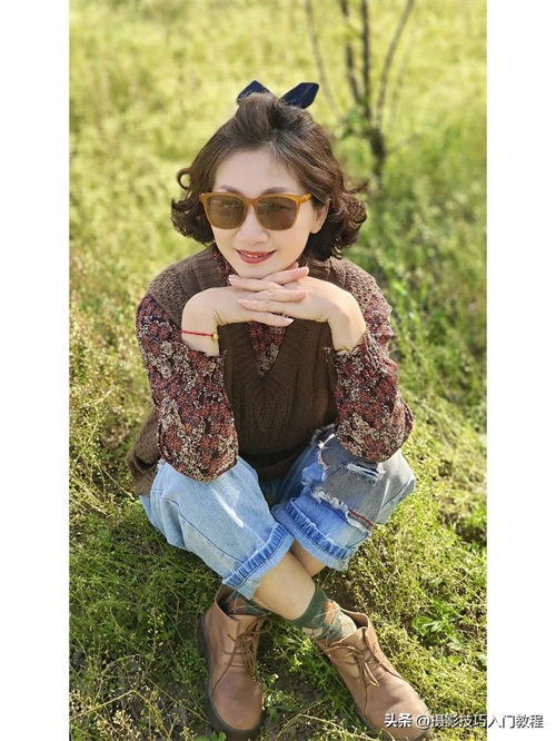 6、盘腿坐在地上,双手交叉放在胸前位置,稍微转头看向远处,眼睛不用和镜头交流,避免表情尴尬。