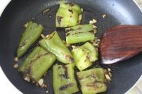 3.锅里不倒油,锅烧热放入青椒段,用铲子按压把青椒稍微炒熟。