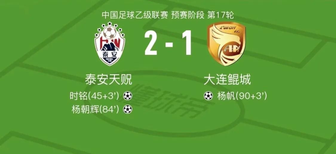 泰安天祝主场迎战大连鲲城,上半场补时阶段泰安天祝世界波破门,下半场大连鲲城齐天雨助攻杨朝辉破门,伤停补时阶段泰安天祝再进一球,经过90分钟激战泰安天祝主场2:1战胜来访的大连鲲城。