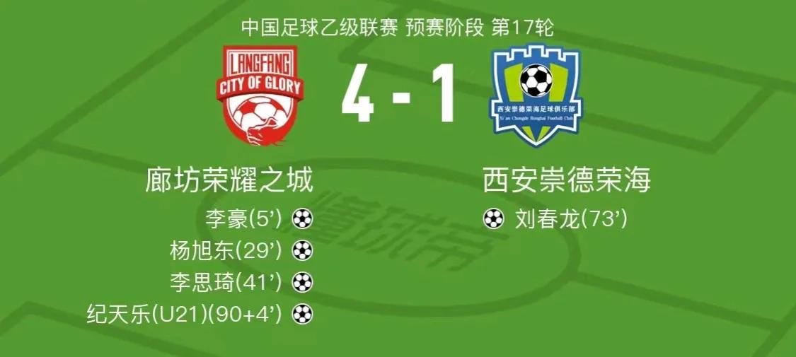河北廊坊荣耀之城本轮比赛主场迎战西安崇德荣海,上半场廊坊荣耀之城在第5分钟和第29分钟、41分钟连续打进三粒进球,下半场第73分钟西安崇德荣海扳回一球,伤停补时主队再进一球4:1战胜对手