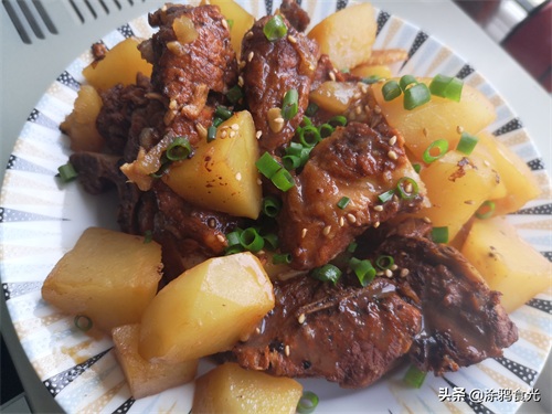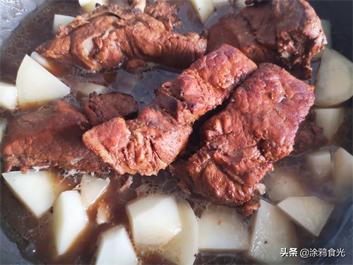 第三步:水开后大火煮10分钟,转小火炖大约40分钟后,加入适量的盐和提前切好的土豆块,继续炖20分钟,最后大火收汁。