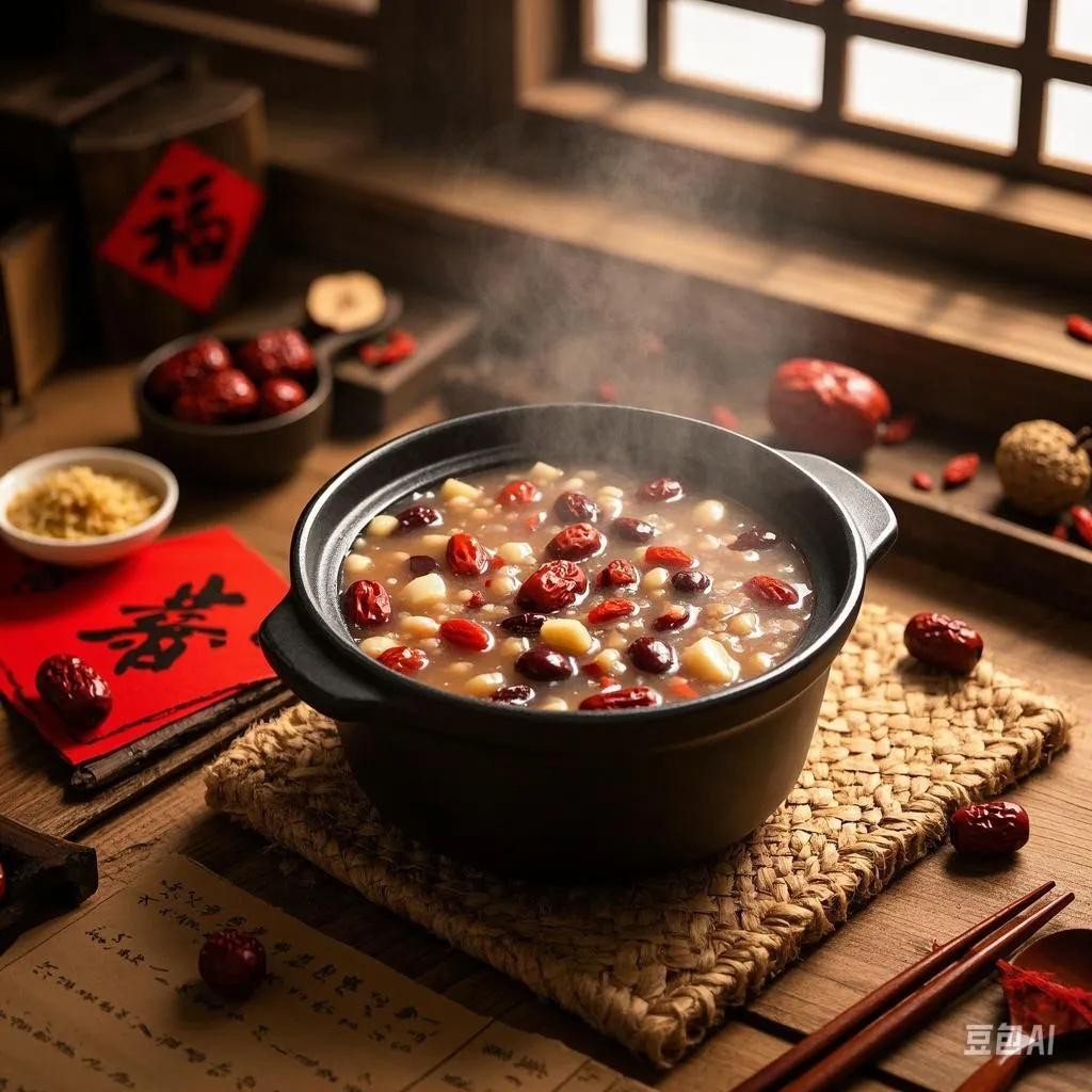 腊八粥的食材丰富多样,汇聚了各种谷类、豆类、果仁等,象征着丰收和团圆。人们在腊八节喝腊八粥,希望来年风调雨顺、五谷丰登、生活富足。