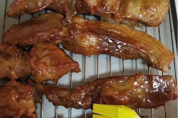 第三步 把烤箱清洗干净,烤箱底部放已经放好一层锡纸烤盘,以防油汁滴落烧糊,,烤箱最上层放烤架,然后预热200度,把腌好的猪肉拿出来,再涂抹少量叉烧酱放到烤架上烤.