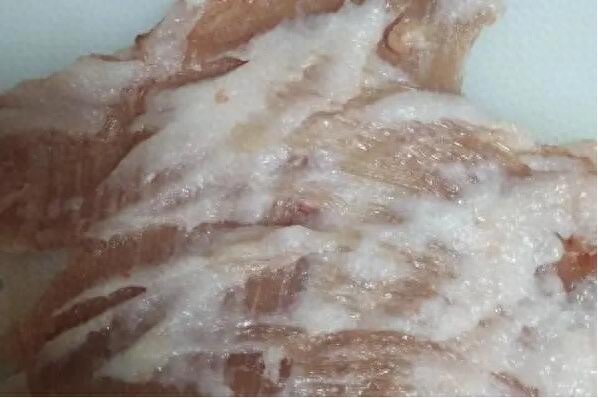 第二步 把猪颈肉洗干净,用料酒、白糖、生抽、老抽、姜末、叉烧酱一起涂抹均匀腌制1个晚上,记得要不时翻身几次好入味.