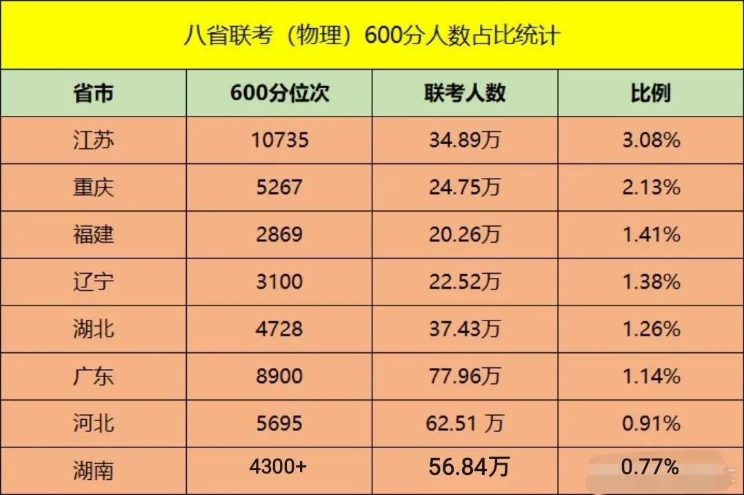 从上表数据来看,说湖南考得太差大致的理由是:湖南高考报名人数是56.84万人,在八省中排第三,而600分以上的人数占比只有约0.77%,还不及河北的0.91%,所以在这次八省联考中是垫底了。而江苏600分以上的约有10735人,在联考总人数34.89万中,这个比例占3.08%。所以这次八省联考,江苏以倒数第8的成绩夺魁了。