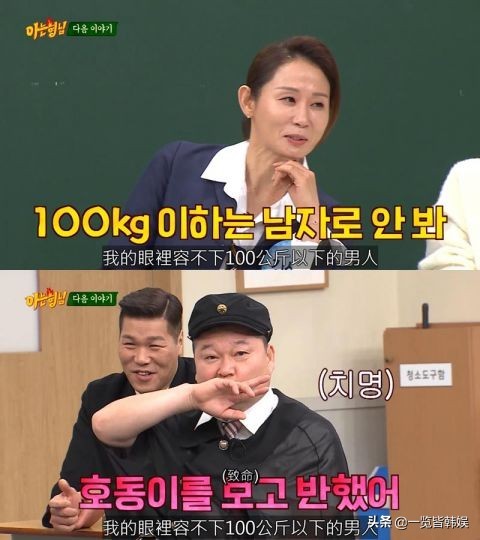 金善映开玩笑表示"我的眼里容不下100公斤以下的男人",天下壮士姜虎东听到之后都害羞了起来,两人之间的互动非常可爱。除了姜虎东之外,金希澈、徐章勋、李尚敏与金善映的互动也很有趣。