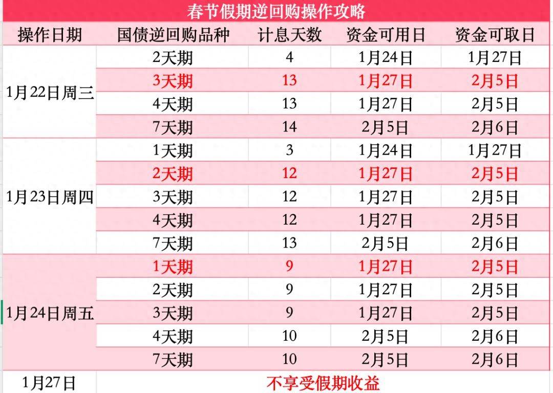 从国债逆回购攻略来看,1月22日操作3天期国债逆回购、1月23日操作2天期国债逆回购、1月24日操作1天期国债逆回购较为划算,值得注意的是,1月27日再操作,则无法享受假期收益。