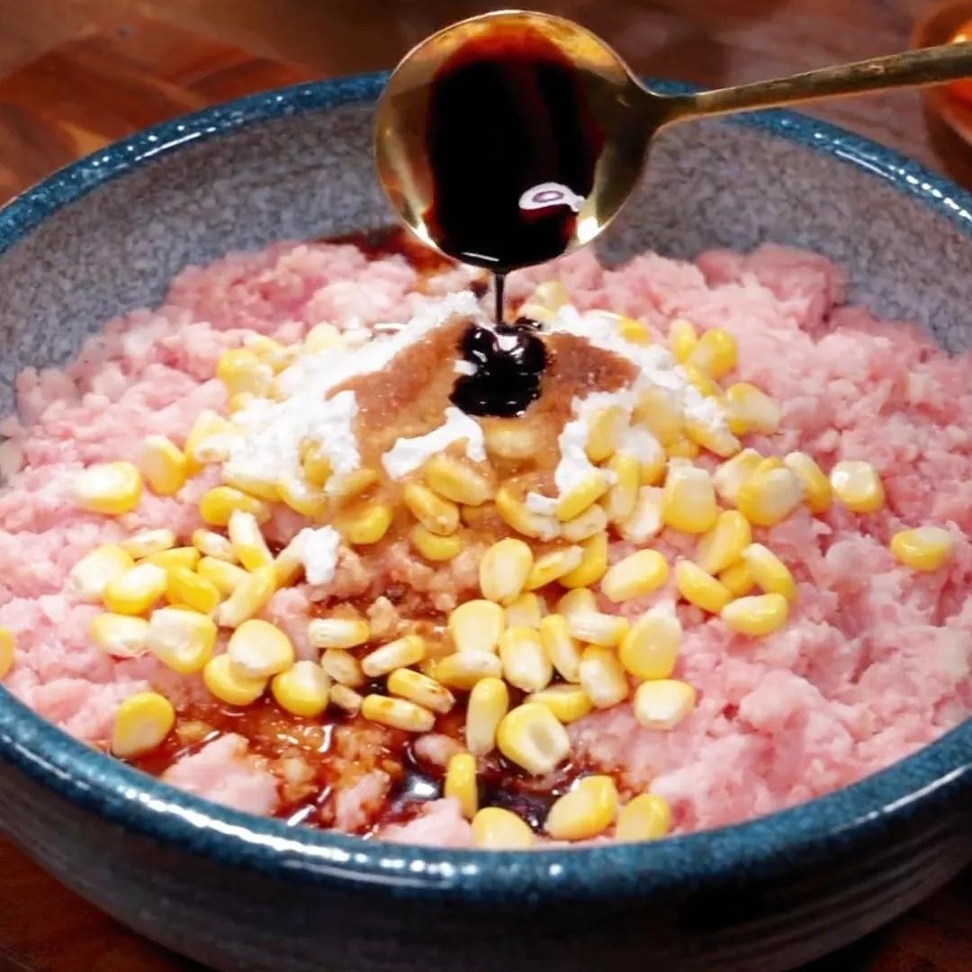 将肉末放入碗中,加入适量的盐、玉米粒、蛋清、白糖、生抽、料酒、蚝油、胡椒粉、淀粉等调料,搅拌均匀。