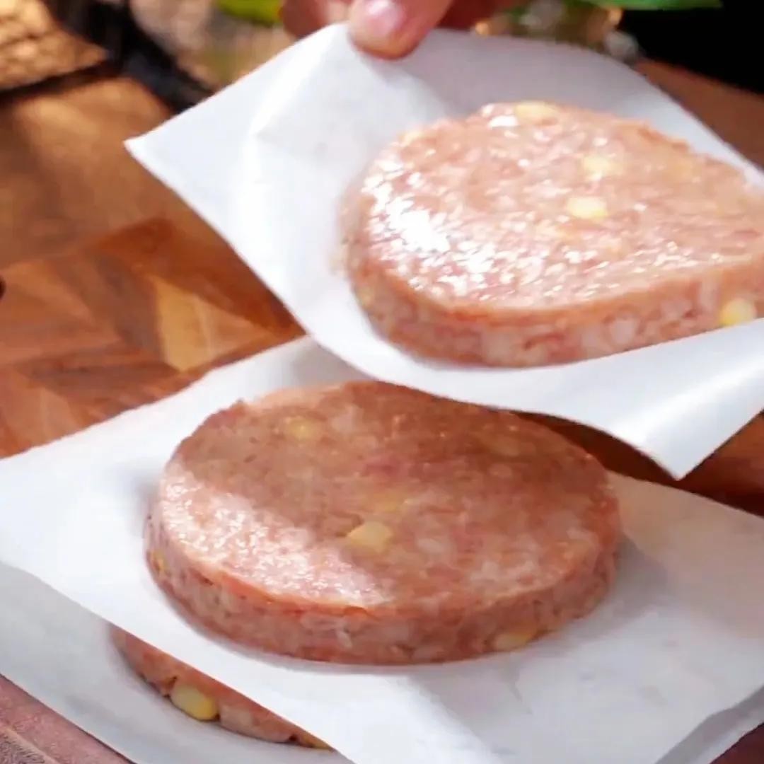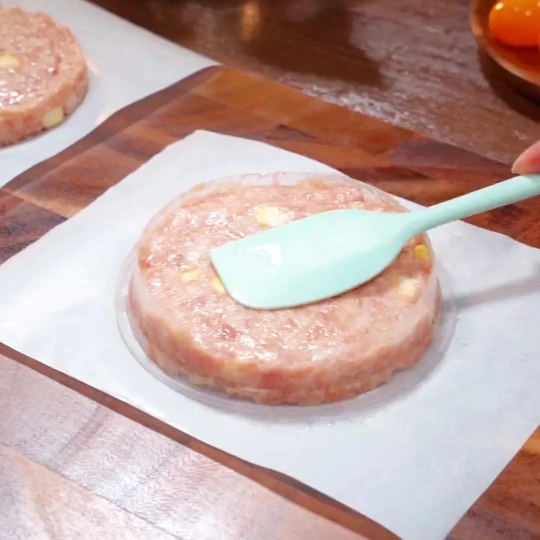 1. 将肉馅放入模具中(自制)压平,制作成饼状。