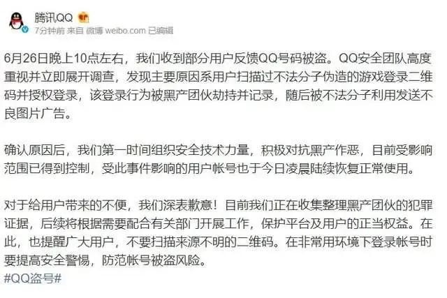Tech星球6月27日消息,针对近日有网友表示自己号码被盗问题,腾讯QQ发文表示,主要原因系用户扫描过不法分子伪造的游戏登录二维码并授权登录,该登录行为被黑产团伙劫持并记录,被不法分子利用发送不良图片广告。确认原因后,我们第一时间组织安全技术力量,积极对抗黑产作恶,目前受影响范围已得到控制,受此事件影响的用户帐号也于今日凌晨陆续恢复正常使用。
