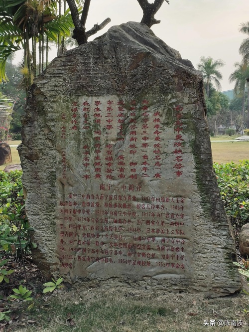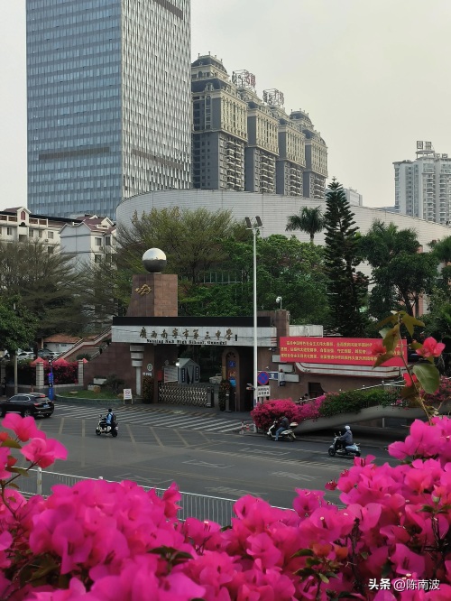 这些资料有点陈旧。我们今天来到南宁三中的校址,却感到其新的面貌。看看在红花丛中的校门,我们发现,学校原来的高中部已经搬迁到新的校区去了,留下的只是初中部。