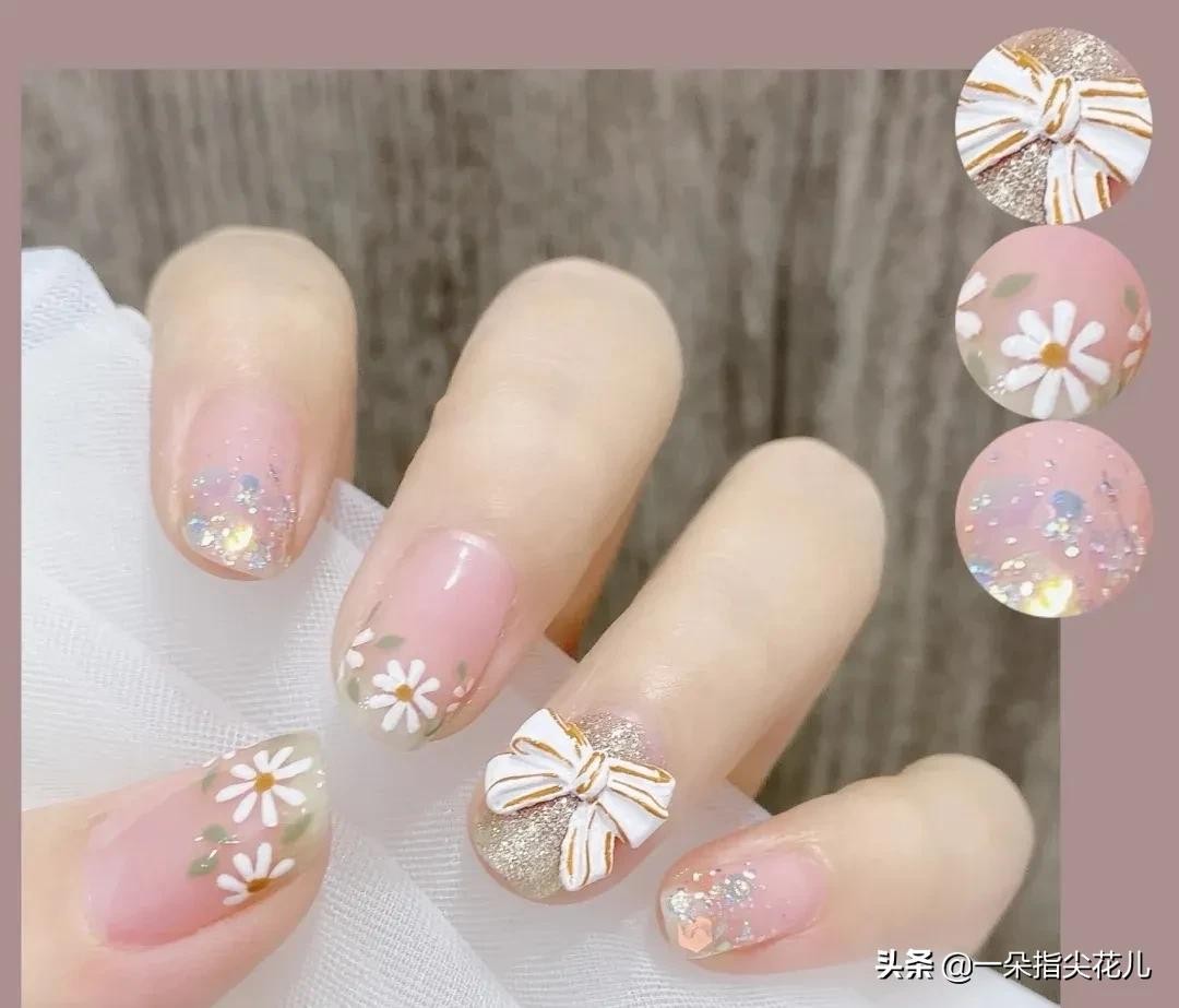 第八款:裸透粉色打底,搭配指尖小雏菊,和跳指七彩亮片和蝴蝶结饰品。