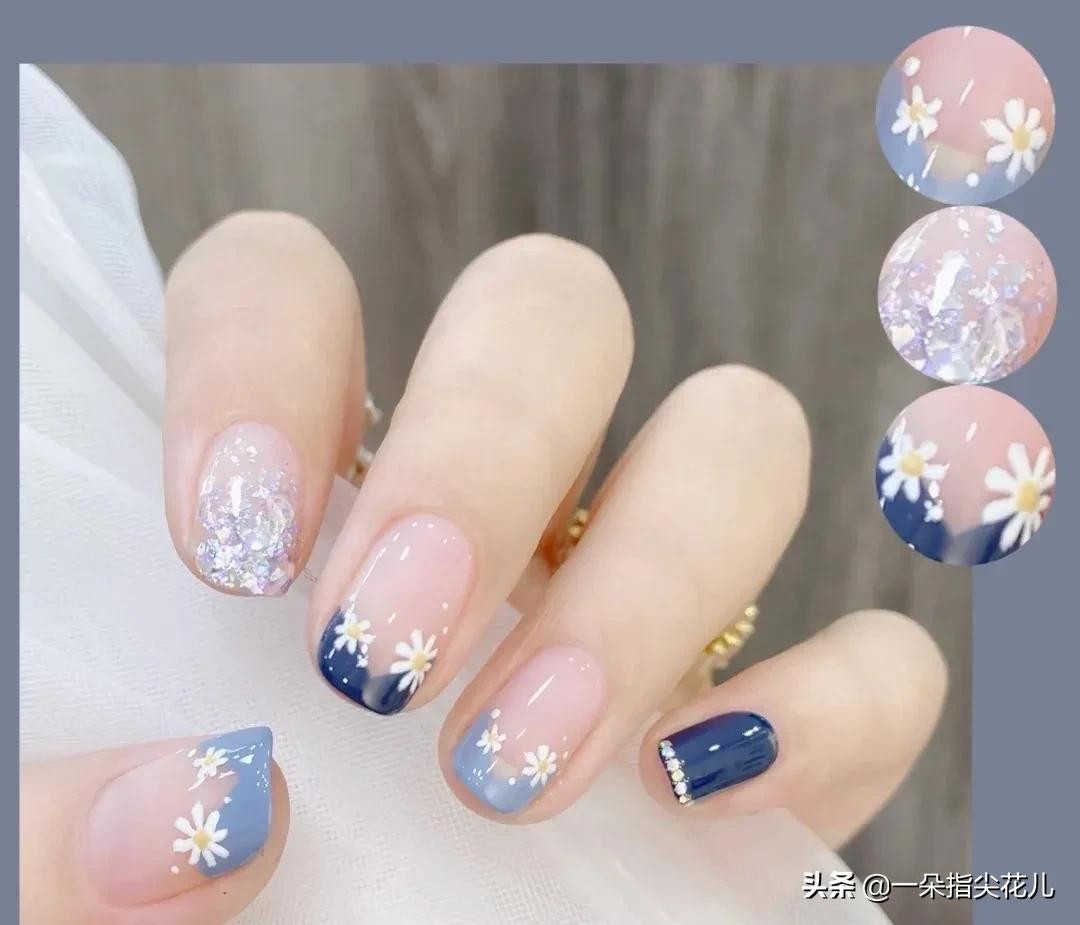 第七款:两款蓝色撞色做成法式边,搭配小雏菊花卉和跳指银色亮片渐变。