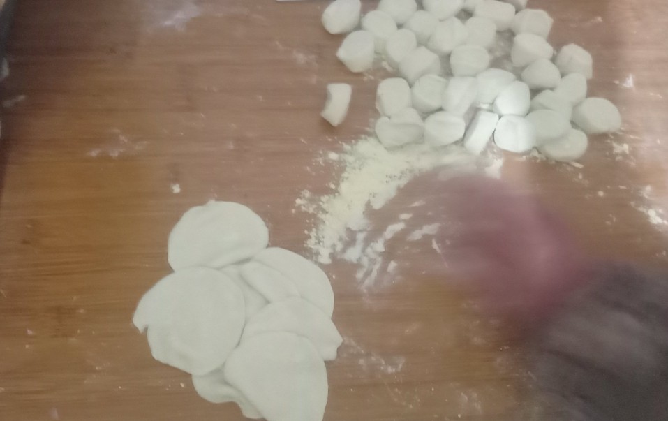 第六步:把面团移到面板上,取一半搓成条,再做成小剂子,擀成中间厚四周薄的面片
