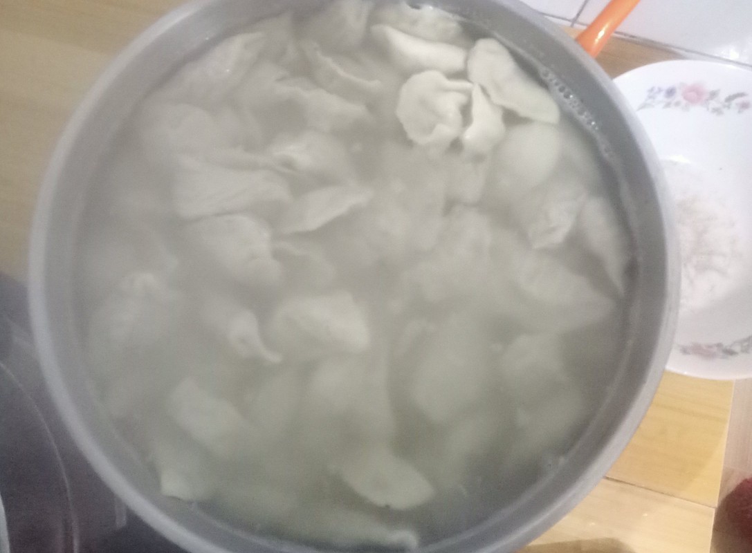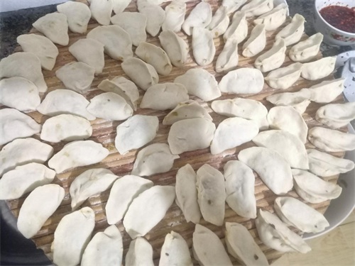 第八步:饺子快包完的时候烧一锅水,水开倒入饺子,用勺子沿着锅边轻轻搅动两下,避免饺子粘连,煮开之后改小火在煮2-3分钟就可以出锅了