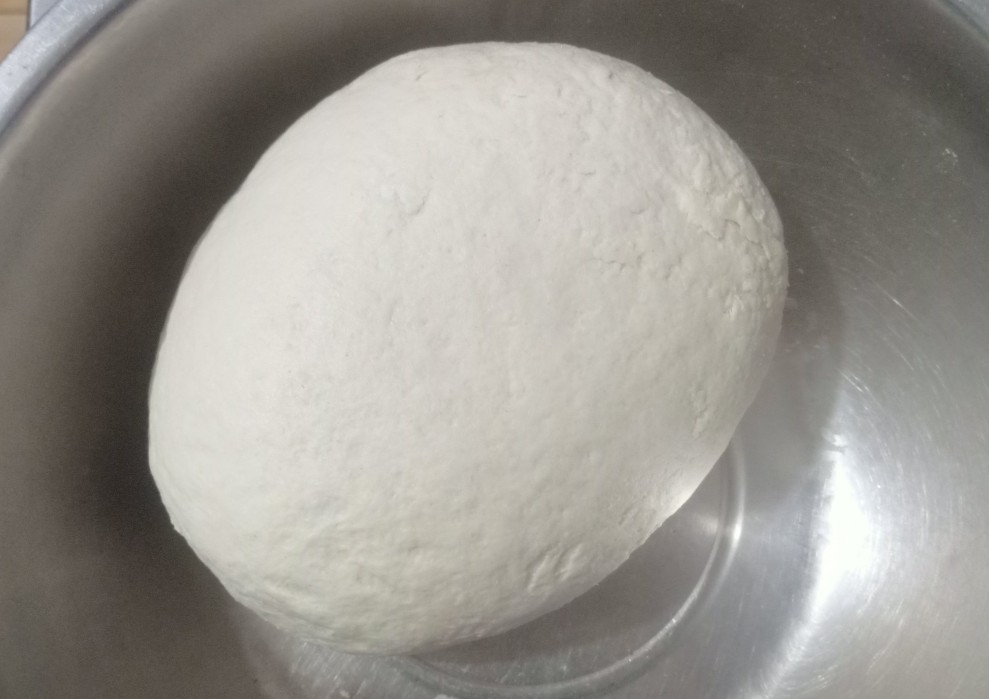 第一步:面粉里慢慢倒入温水搅成面絮,再下手揉成光滑面团