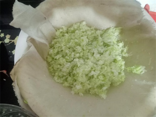 第三步:把大白菜切碎,把白菜加点盐放进绞肉机里打碎,然后倒入笼布里挤干水分,这样做出来饺子就不会有菜水味儿