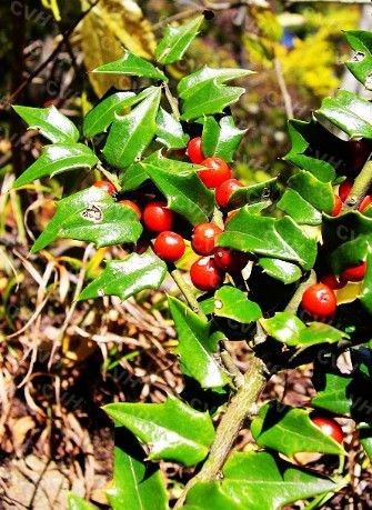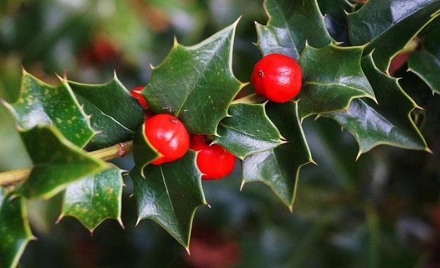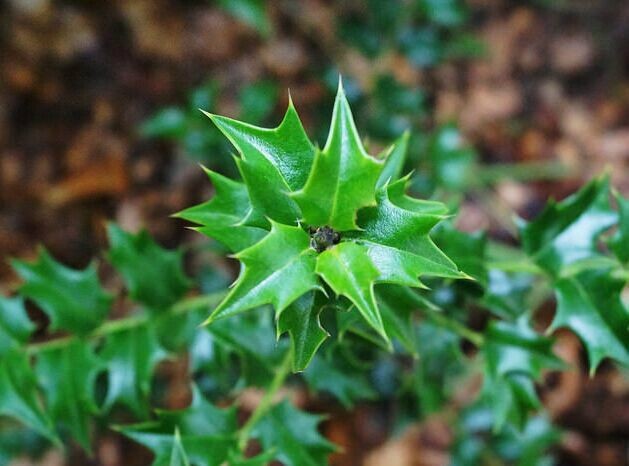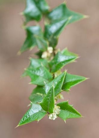 叶革质,有光泽,三角状卵形,长1.5-3公分,先端急尖,刺状,基部平截或微心形,叶边有1-3对大刺齿,刺三角形,坚硬,向外伸展,中脉在上面稍下凹,不明显,侧脉1-3对,叶柄长2毫米左右;