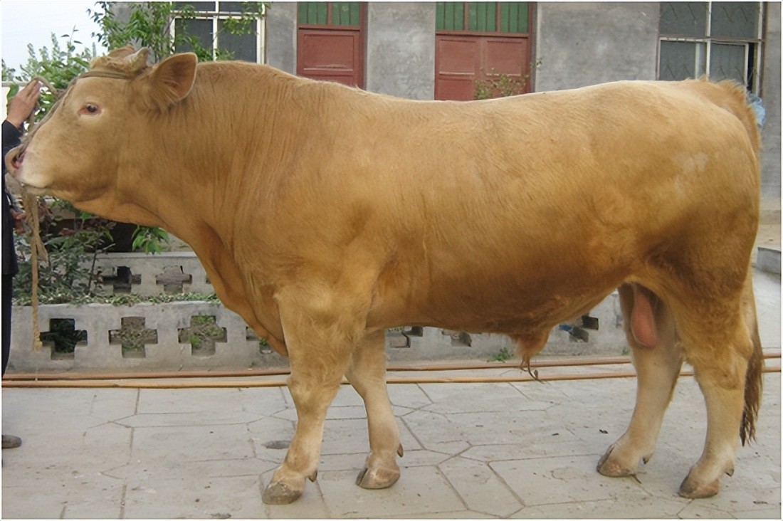 外貌特征:利木赞牛毛色为红色或黄色,口、鼻、眼田周围、四肢内侧及尾帚毛色较浅,角为白色,蹄为红褐色。 头较短小,额宽,胸部宽深,体躯较长,后躯肌肉丰满,利木赞牛四肢粗短。