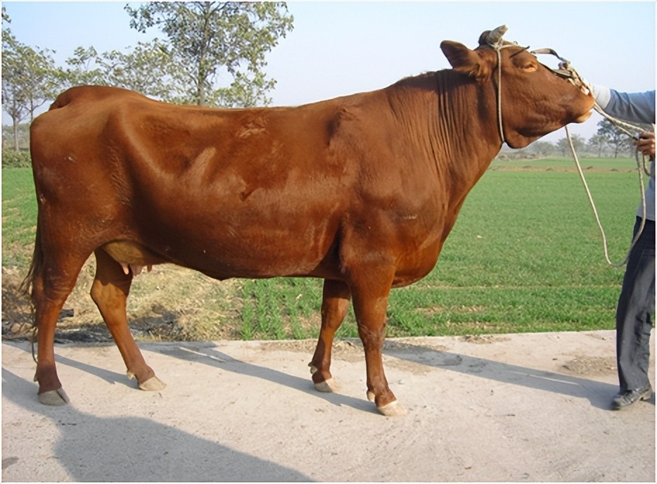 外貌特征:毛色为黄白花或淡红白花,头、胸、腹下、四肢及尾帚多为白色,皮肢为粉红色,头较长,面宽;角较细体躯长,呈圆筒状,肌肉丰满;前躯较后躯发育好,胸深,尻宽平,四肢结实,大腿肌肉发达;乳房发育好