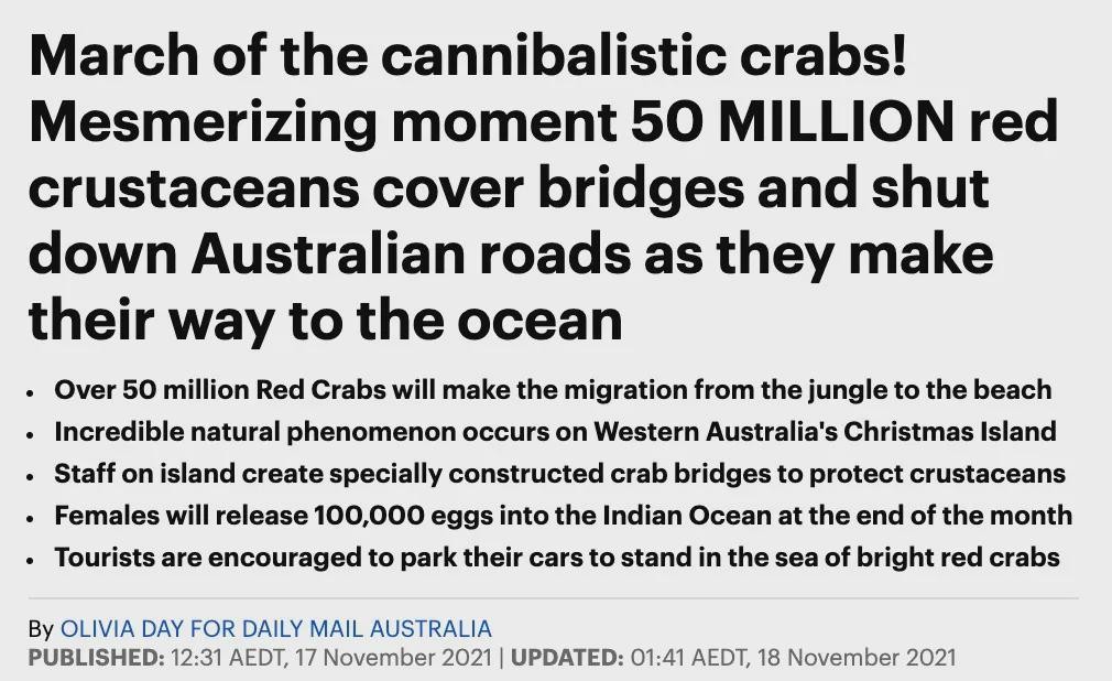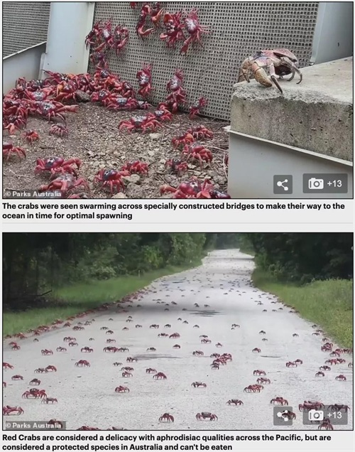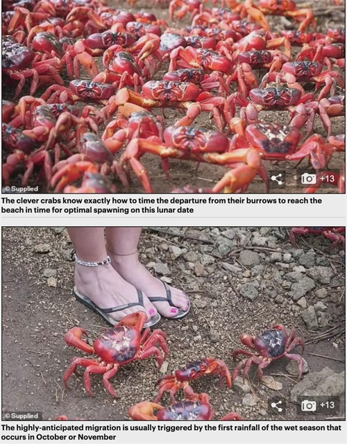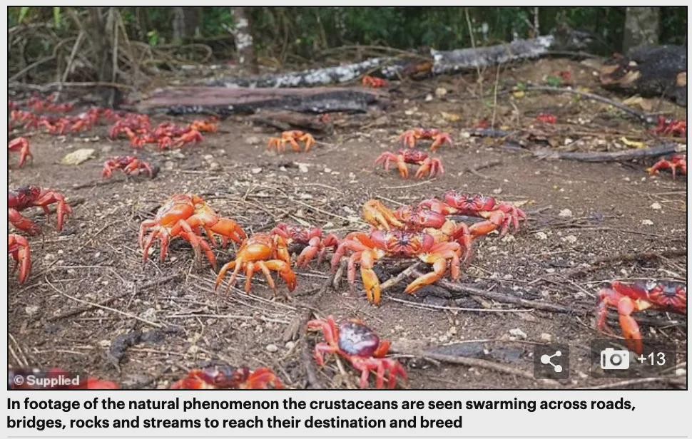 圣诞岛入侵物种项目协调员Tanya Detto博士告诉《每日邮报》,自2005年以来,该地区就没有见过这么多迁徙螃蟹。