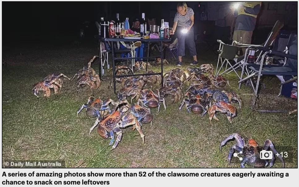 在一系列令人震惊的照片中,有超过52只强盗蟹急切地等待机会吃一些剩菜。