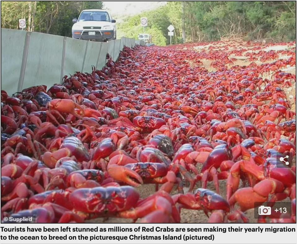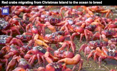 据悉,数以百万计的红蟹每年都要迁徙到海洋中,在风景如画的圣诞岛上繁殖。