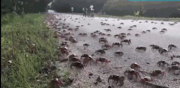 可以看到这些甲壳类动物成群结队地穿过道路、桥梁、岩石和溪流,以及时到达目的地进行繁殖。