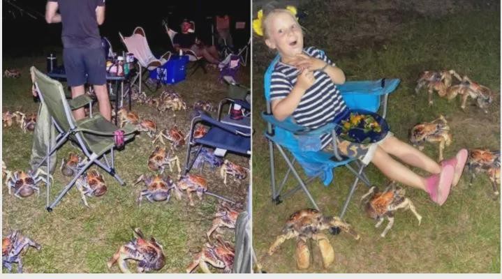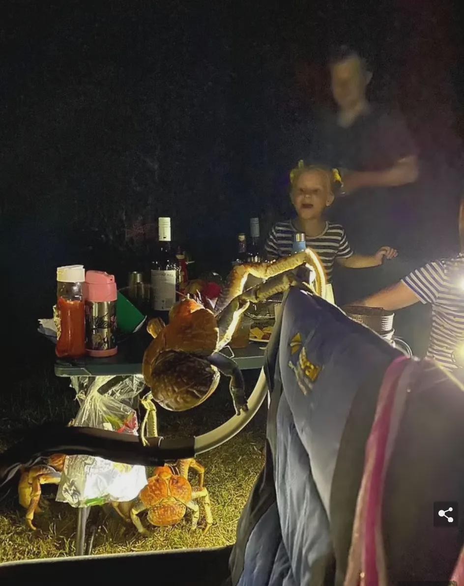可以看到这些螃蟹爬上折叠椅、桌子甚至烧烤架,