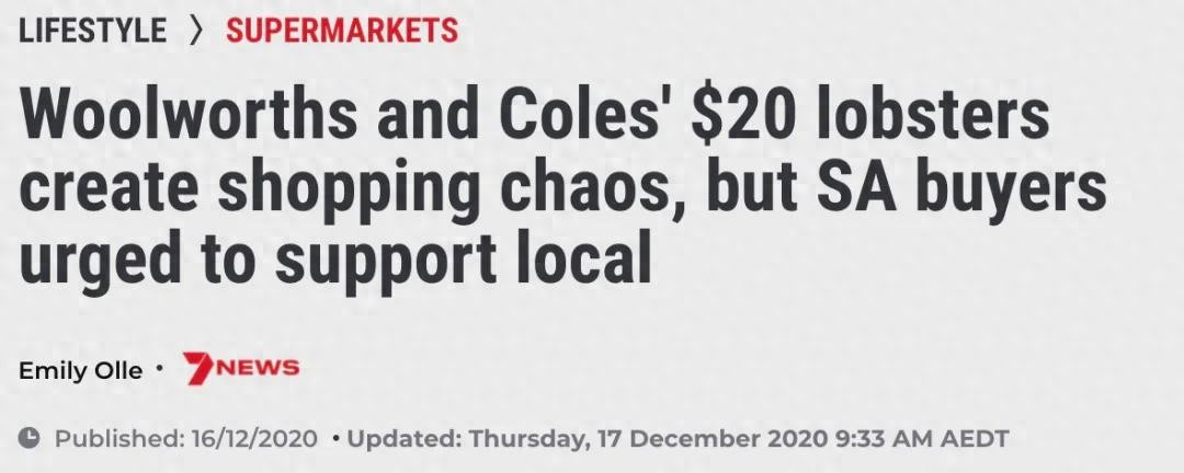 去年12月,Coles和Woolworths以每只20澳元的价格,出售西澳龙虾,是2019年圣诞节前价格的一半。