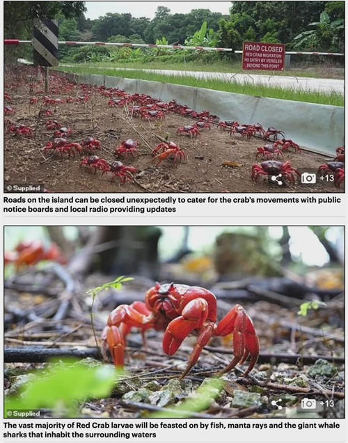 岛上的道路会因蟹类的活动而临时关闭,公共告示板和当地电台会提供蟹类迁徙的最新消息。