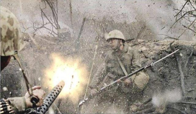 在途中他还看到了令人震惊的一幕,日军居然拖走自己同胞的残骸,堆在一起当作掩体,掩护他们冲锋。