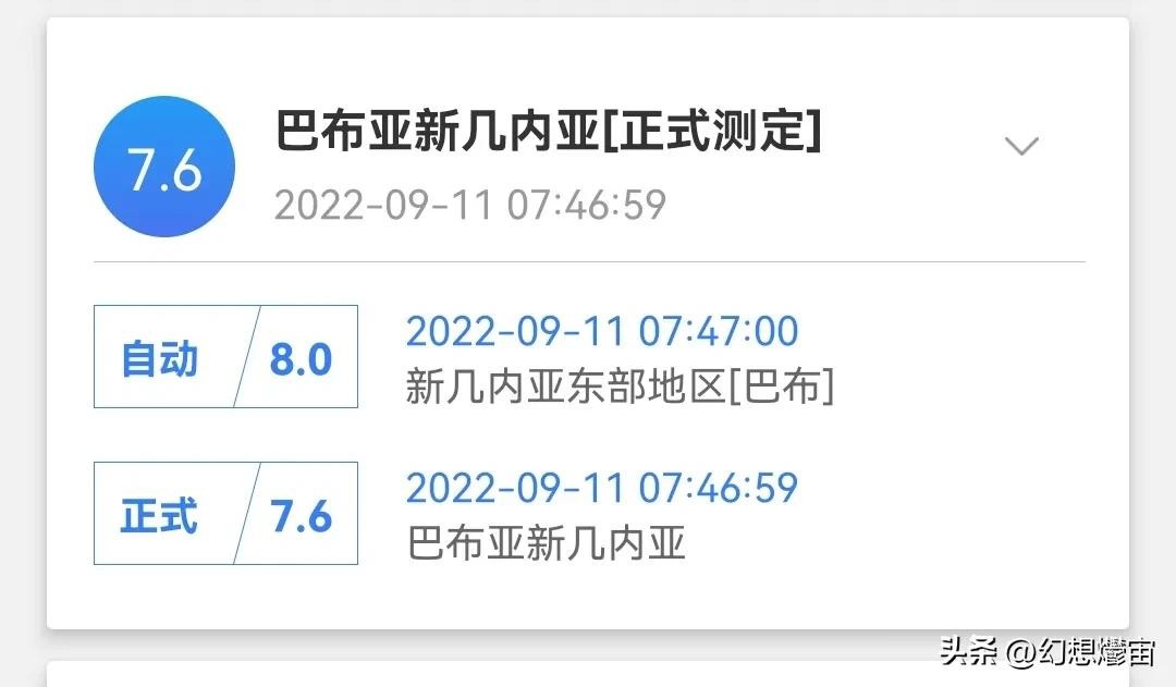 200年最大级别地震:据中国地震台网正式测定,北京时间9月11日7时46分(当地时间9月11日9时46分)在巴布亚新几内亚发生7.6级地震,震源深度70千米,震中位于南纬6.30度,东经146.55度。稍后系统自动测评为8.0级大地震。