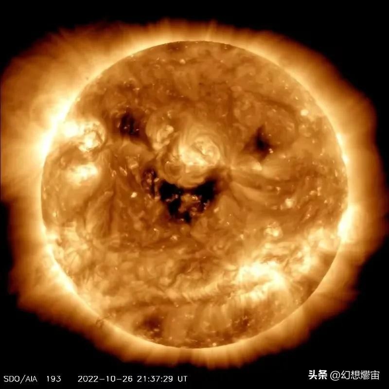 2022年11月11号,美国宇航局拍摄到的太阳露出“笑脸”的时刻,美国时间10月26日21点,因为太阳上出现的“笑脸”其实主要是三个黑色斑块组成的,这三个黑色斑块就是日冕洞。说未来一段时间会影响地球磁场和造成降温!