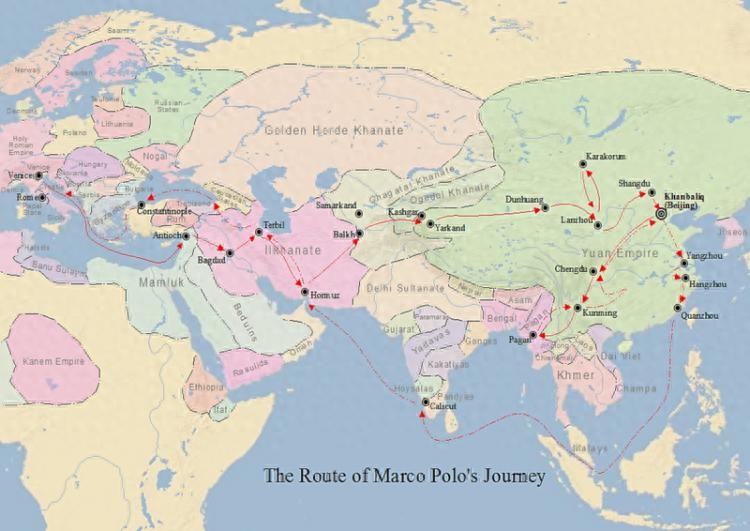 马可·波罗是一位威尼斯商人和冒险家,在1271年至1295年间沿着丝绸之路从欧洲到亚洲。他最初被邀请与他的父亲和叔叔一起进入忽必烈汗(1215-1294)的宫廷,他在中国呆了17年,蒙古统治者派他前往帝国的遥远地区进行实况调查。