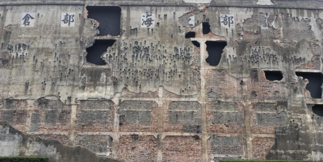 四行仓库现状,墙上弹孔累累