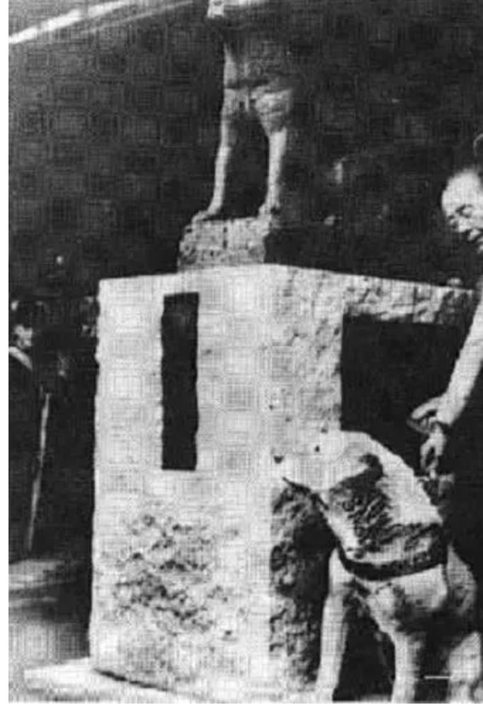 小八事迹被报道不久后1934年4月,八公铜像在涩谷车站前建立。揭幕仪式有300位名人参加。小八“本犬”也出席了铜像的揭幕式。此后,铜像附近的车站入口就被称为“八公入口”。