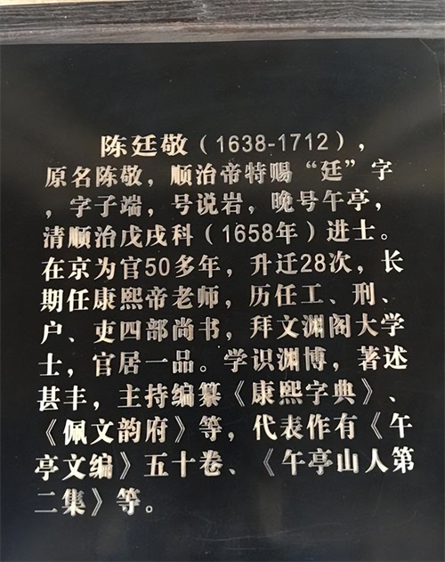 康熙皇帝称赞陈廷敬说:“我朝名相,实出阁老。”《康熙字典》为中国第一部字典,它对后世影响很大,是中华辞书史上的一部杰作。
