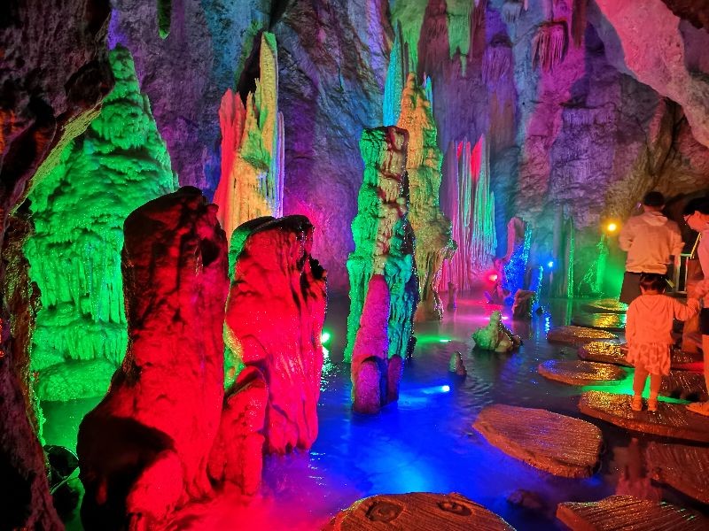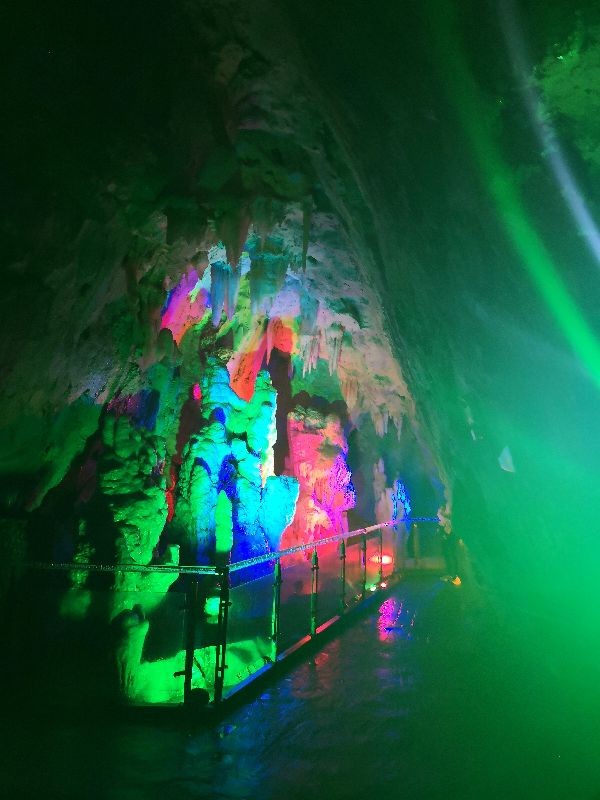 走进洞中,就倍感清凉,里面的温度约有20度左右,上面和左右都是石壁,并不平坦,光打上以后色彩斑斓,仿佛走入仙境一般。