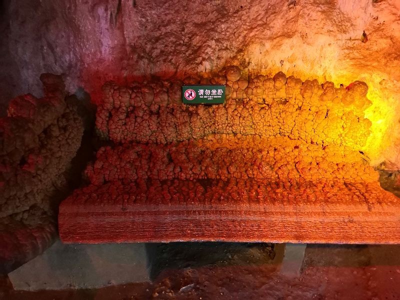 而这个石花长椅是由天然的大小石花壁组成,由飞溅雾喷水形成的,地质专家称此为国宝级文物,只可远观,不可坐卧。