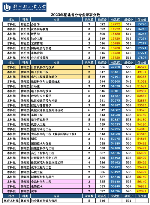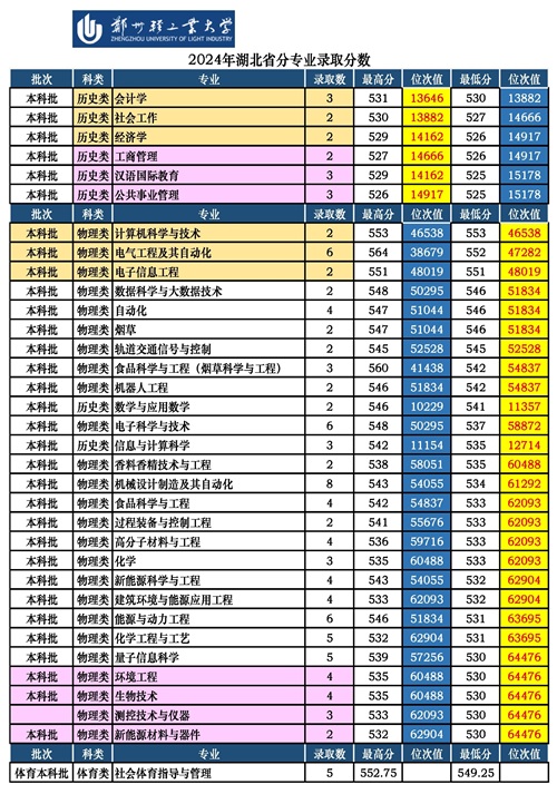 郑州轻工业大学2024年分专业录取分数及位次值【湖北省】