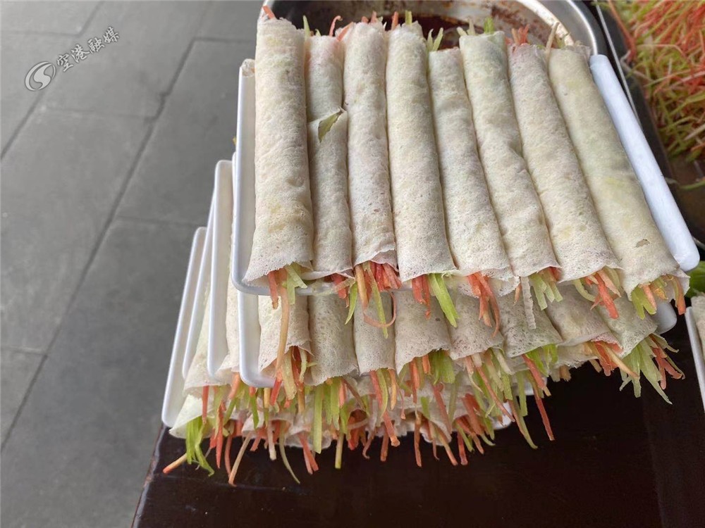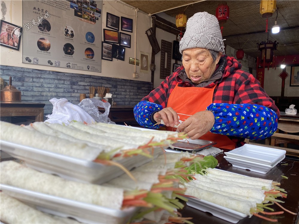 彭镇春卷婆婆朱旭如的春卷薄而酥软,包着胡萝卜、青笋一起食用,在春天的第一天就吃得清清爽爽。“今天有很多人来吃,还在排队,立春吃春卷寓意来年越过越好。”朱旭如说。