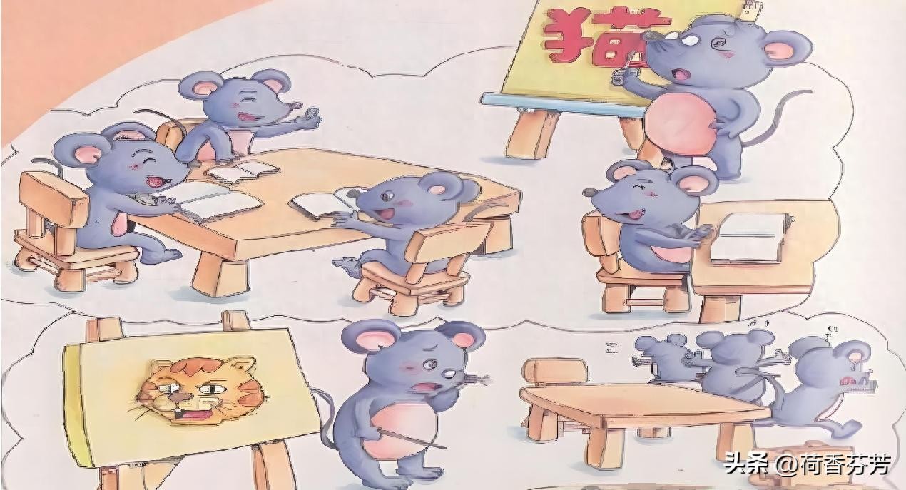 一天,一群小老鼠在教室里上课,老师在黑板上写了一个大"猫"字,小老鼠们都觉得很新鲜,便纷纷议论起来。